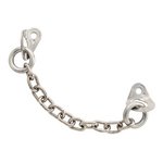 Stainless steel belay station with two 10 mm bolt hangers, a chain, and a D-shape carabiner with screwlock and splint. The recommended drill hole distance